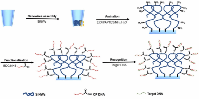 图1. SiNWs@GMP传感器用于超灵敏检测目标DNA的示意图。