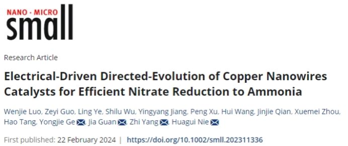 相关研究成果以《Electrical-Driven Directed-Evolution of Copper Nanowires Catalysts for Efficient Nitrate Reduction to Ammonia》为题发表在国际著名期刊《Small》(IF:13.3)上。永利3044集团官网2020级研究生罗文杰和2022级研究生郭泽佚为第一作者,永利杨植教授、聂华贵教授、葛勇杰副研究员和贯佳副教授为共同通讯作者。
