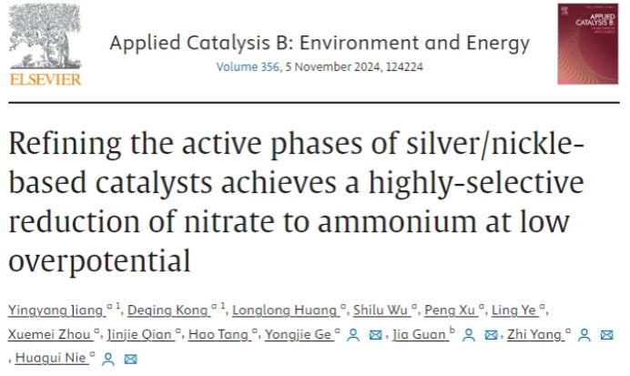 相关研究成果以《Refining the Active Phases of Silver/Nickle-based Catalysts Achieves a Highly-Selective Reduction of Nitrate to Ammonium at Low Overpotential》为题发表在《Applied Catalysis B-Environmental》(IF:22.1)上。永利3044集团官网2021级研究生江颍洋和2022级研究生孔德清为第一作者,永利杨植教授、聂华贵教授、葛勇杰副研究员和贯佳副教授为共同通讯作者。