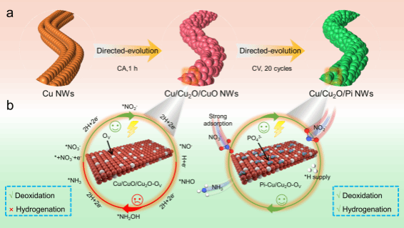 然而,NO3RR是一个复杂的8电子过程,过程中涉及到一系列的脱氧和加氢反应,从而降低了整体反应的动力学速率。为了提升NO3RR整体的反应速率,团队基于定向进化策略和反应路径的调控策略开发了两款高效的催化剂,具体研究内容如下:
