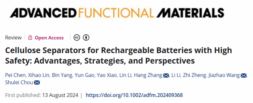 该工作以“Cellulose Separators for Rechargeable Batteries with High Safety: Advantages, Strategies, and Perspectives”为题发表在《Advance Functional Materials》。文章第一作者永利硕士研究生陈霈,通讯作者为永利3044集团官网侴术雷教授、张杭博士、澳大利亚伍伦贡大学王佳兆教授,第一通讯单位为永利3044集团官网。该工作得到了国家自然科学基金、中国高端外国专家培养计划、温州市基础研究项目和中国博士后科学基金的资助。