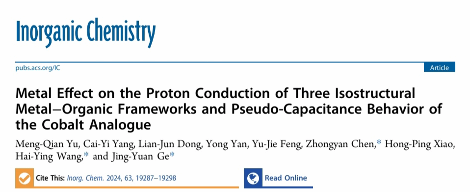 相关研究成果以“Metal Effect on the Proton Conduction of Three Isostructural Metal−Organic Frameworks and Pseudo-Capacitance Behavior of the Cobalt Analogue”为题,近日发表在《Inorganic Chemistry》期刊上,永利2022级硕士研究生余梦倩为第一作者,永利3044集团官网为第一通讯单位,陈忠研博士、王海英副教授和葛景园副教授为共同通讯作者。该工作受到国家自然科学基金(21801054和21801127)、温州市基础科研项目(G2023012)和浙江省基金项目(LY20B010003)的资助。