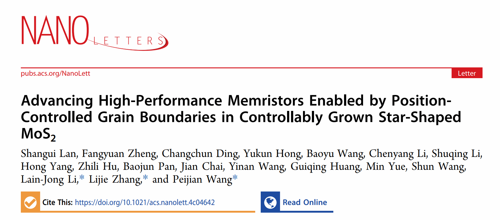 该工作以“Advancing High-Performance Memristors Enabled by Position-Controlled Grain Boundaries in Controllably Grown Star-Shaped MoS2”为题发表在国际纳米顶尖期刊《Nano Letters》上。永利3044集团官网为第一通讯单位,化材学院王佩剑副教授和张礼杰教授为通讯作者。本研究工作得到温州市基础科学研究项目(G20240021)、国家自然科学基金委(51902061, 62090031, 52072272)资助完成。