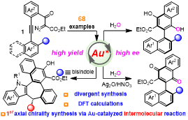 由于金(I)配合物的线性配位带来的固有挑战,不对称金催化过程仍然具有挑战性,尤其是在轴向手性骨架的不对称合成中。除了极少数的分子内简单环化的报道,通过不对称金催化的分子间炔烃转化构建轴向手性化合物仍未开发。