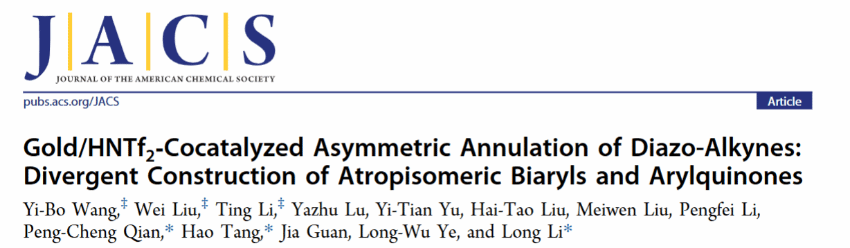 此项工作以Gold/HNTf2-Cocatalyzed Asymmetric Annulation of Diazo-Alkynes: Di-vergent Construction of Atropisomeric Biaryls and Arylquinones为题发表在国际顶级期刊JACS上,永利3044集团官网作为第一单位,钱鹏程教授,汤浩教授,李龙教授为通讯作者。该研究工作主要由钱鹏程-李龙团队2022级研究生王一波、博士后刘玮、李亭共同完成,并得到课题组其他研究生和本科生协助。理论计算部分由永利3044集团官网汤浩教授完成。同时南方科技大学李鹏飞教授对我们的工作中绝对构型的测定做出突出贡献。研究工作得到国家自然科学基金(21828102, 22303062, 22401218)、浙江省自然科学基金(LQ23B020002, LY22B030002, LQ22B030004)温州市科技局项目(G20220023),温州市化学会服务站等资助。