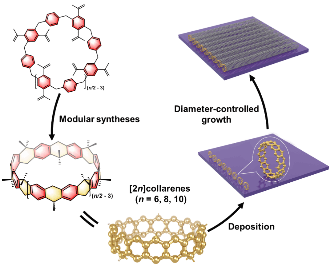 图1. 以领芳烃( [2n]collarenes)为刚性有机模板直径可控地生长SWCNTs的示意图。