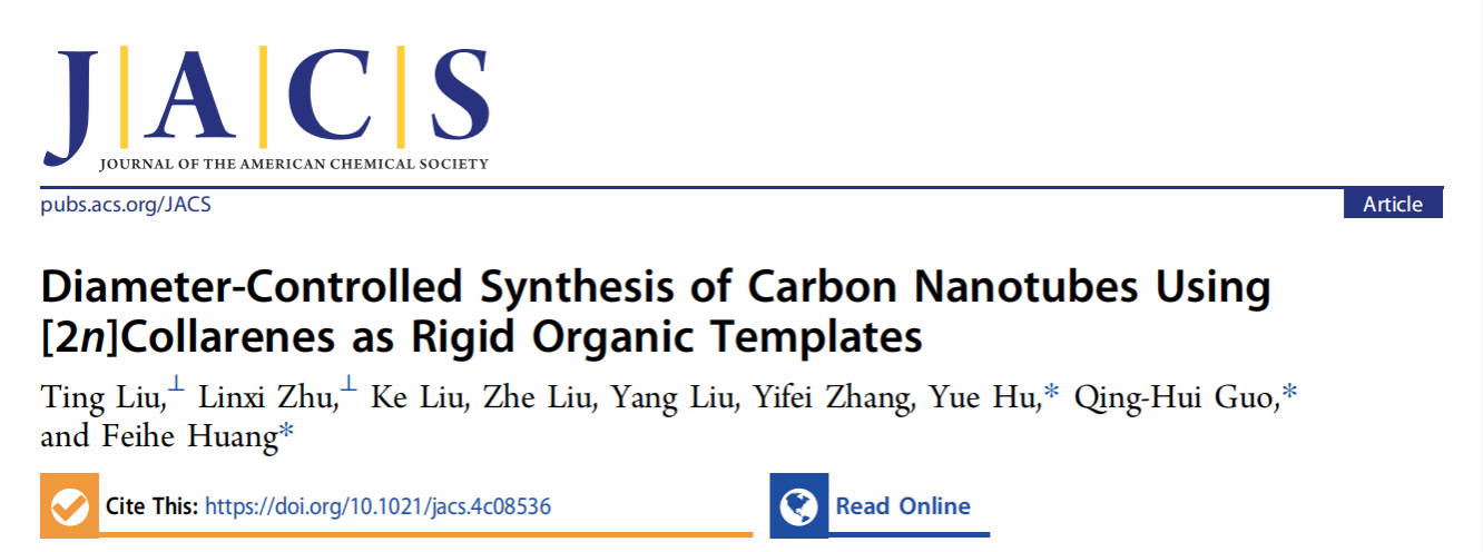 单壁碳纳米管(SWCNTs)因其卓越的理化性质而备受关注。碳纳米管的直径对其性质有着重要影响。因此,直径可控地合成SWCNTs对其实际应用至关重要。利用有机分子为模板实现SWCNTs的生长具有重要价值。首先,其结构明确,有利于SWCNTs的直径可控生长。其次,有机模板避免了金属污染问题。在过去十年中,使用有机模板(如CPP和曲面多环芳烃)生长SWCNTs取得了巨大的进展。然而,高效生长窄直径分布的SWCNTs仍然面临挑战。其中最大的阻碍是缺乏合适的模板分子。分子碳纳米带做为碳纳米管的最小重复单元,其刚性结构为SWCNT生长提供精准模板,有利于SWCNT直径可控制备,因此在碳纳米管生长领域引起了广泛关注。然而迄今为止,利用分子碳纳米带为模板实现SWCNTs的直径可控生长仍未被报道。近日,永利3044集团官网胡悦特聘教授、清华大学郭庆辉副教授、浙江大学黄飞鹤教授合作在该领域实现了突破。
