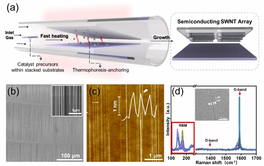 近日,永利化材学院胡悦特聘教授团队与香港城市大学林德武研究员合作,发展了一种名为“热泳-锚定”的策略,成功制备出均匀分散且尺寸可控的非金属SiOx催化剂,用于生长水平排列的SWNT阵列。该策略通过硅基热解前驱体产生大量SiOx颗粒,由于温度迅速升高引起的热浮力,这些颗粒在石英基底上发生自下而上沉积。同时,机械力诱导促进的表面重构在石英衬底上形成大量锚点,有助于捕获催化剂,抑制其迁移和聚集,从而实现小尺寸催化剂的均匀沉积。利用这些非金属SiOx催化剂,研究团队成功合成了密度高达9根每微米的SWNT阵列。值得注意的是,拉曼光谱和电学表征显示,这些直接生长的SWNT阵列中半导体的比例高达94%,这一成果归功于密闭空间内原位蚀刻机制。这项工作为下一代碳基纳米器件的技术实际应用提供了一条切实可行的路径。