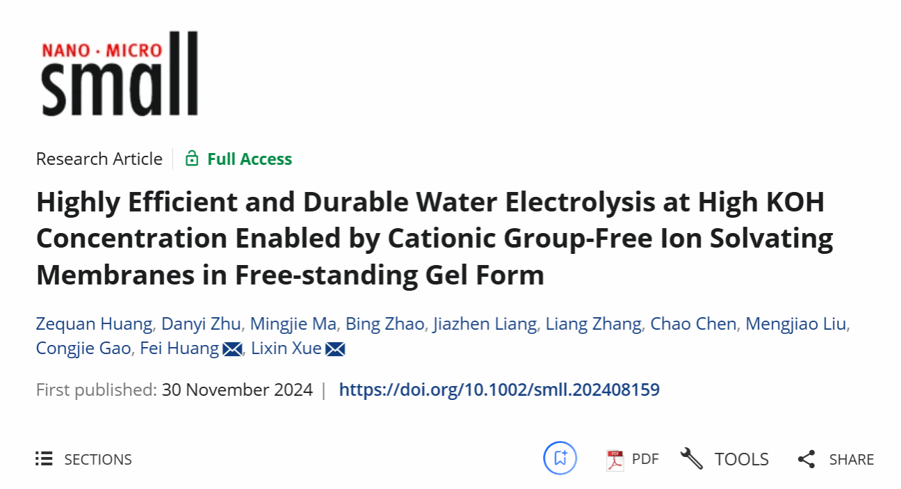 近日,永利薛立新研究员与浙江工业大学黄菲教授合作团队在国际知名的期刊 Small上发表题为“Highly Efficient and Durable Water Electrolysis at High KOH Concentration Enabled by Cationic Group-Free Ion Solvating Membranes in Free-standing Gel Form”的研究论文。该工作提出了一类新型的独立式凝胶形式的无阳离子基团的离子溶剂化膜 (ISM-PBI-FG) 用于高效和耐用的碱性水电解。该膜以凝胶形态存在,通过溶胶-凝胶转变过程后经KOH吸收制备而成。与传统的 AEM 和PBI基 ISM 相比,ISM-PBI-FG 膜具有多孔的内部结构和致密的外表面,为碱性电解质的吸收提供了更大的体积,并为离子传输创造了纳米级通道。ISM-PBI-FG膜是由纠缠的聚苯并咪唑(PBI)纳米纤维组成的3D多孔微观结构,实现了89%的孔隙率,使其能够吸收极高的碱液(在6 M KOH中为346%)并展现出卓越的离子传导性(在80°C时为763 mS cm⁻¹)。这一概念的可行性通过 AWE 测试得到了验证,其中使用 NiFe/Raney Ni(不含 PGM)和 NiFe/Pt/C (PGM) 催化剂组合,在 2.0V 下电流密度分别达 2.2 A cm-² 和 5.5 A cm-²,实现了优异的水电解性能。本研究工作得到国家自然科学基金委基金项目(22209147)和中国工程院院士咨询项目(2022-DZ-08)的资助完成。