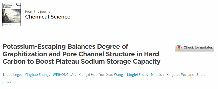 此项工作以Potassium-Escaping Balances Degree of Graphitization and Pore Channel Structure in Hard Carbon to Boost Plateau Sodium Storage Capacity为题发表在国际期刊Chemical Science上,永利3044集团官网作为第一单位,侴术雷教授,吴星樵老师为通讯作者。2021级联培研究生勒格牛布、化材学院2022级研究生张颖豪为共同第一作者,并得到课题组其他研究生和本科生协助。研究工作得到了国家自然科学基金,中国高端外国专家招聘计划,浙江省自然科学基金等项目支持。