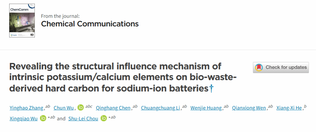 该成果以“Revealing the structural influence mechanism of intrinsic potassium/calcium elements on bio-waste-derived hard carbon for sodium-ion batteries”为题,发表在Chemical Communications上。永利2022级硕士生张颖豪为论文第一作者,侴术雷教授、吴星樵博士为该论文共同通讯作者,永利3044集团官网为第一通讯单位。相关工作受到国家自然科学基金、浙江省自然科学基金、温州市自然科学基金等资助。