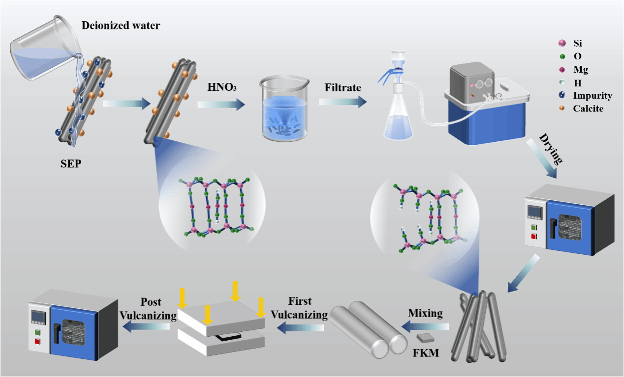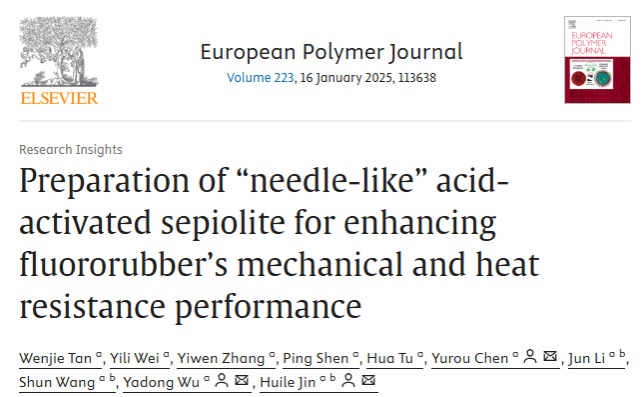 该成果以“Preparation of “needle-like” acid-activated sepiolite for enhancing fluororubber’s mechanical and heat resistance performance”为题发表在European Polymer Journal期刊(IF=5.8,SCI二区)上,永利3044集团官网为第一通讯单位,永利研究生谭文杰为该论文的第一作者,永利金辉乐教授、吴亚东博士和陈雨柔博士为共同通讯作者。