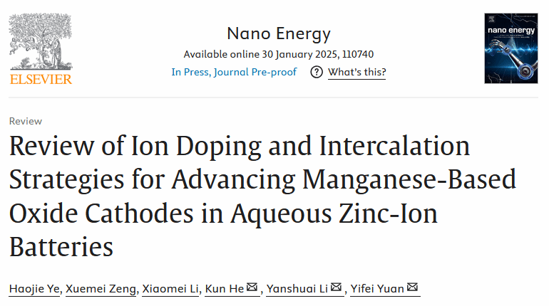 该综述论文以“Review of ion doping and intercalation strategies for advancing manganese-based oxide cathodes in aqueous zinc-ion batteries”为题发表于纳米能源领域国际顶级期刊⟪ Nano Energy ⟫(IF=16.8,中科院一区)。永利3044集团官网为第一通讯单位,永利化材学院21级本科生叶浩洁为第一作者,永利化材学院袁一斐、李彦帅、何坤教授为通讯作者,相关工作得到了国家自然科学基金、浙江省杰出青年基金等项目的资助。