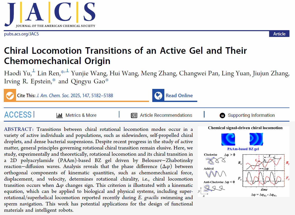 近日,永利化材学院任林教授与中国矿业大学高庆宇教授和美国布兰迪斯大学I.R. Epstein教授紧密合作取得活性运动研究领域重要进展,相关成果以"Chiral Locomotion Transitions of an Active Gel and Their Chemomechanical Origin"为题发表于化学领域顶级期刊Journal of the American Chemical Society。永利为第一通讯单位,永利任林教授、中国矿业大学高庆宇教授和美国布兰迪斯大学I.R. Epstein教授为共同通讯作者。