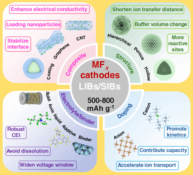 为了提高锂/钠离子电池(LIB/SIB)的能量密度并降低成本以实现其大规模应用,高容量且廉价的新型正极材料被热门研究。基于转换反应多电子转移机理的过渡金属氟化物(MFx, M = Mn, Fe, Co, Ni, Cu等)展现出 500-800 mAh g-1的高容量(是传统商用正极的3-7倍),且具有易制备、低成本和资源丰富等显著优势,被认为是有希望的新型高性能正极。然而,常规结构MFx具有低电导率、结构易粉化、电化学动力学迟缓及电极界面不稳定等缺陷,导致电池表现出短循环寿命和差倍率性能。