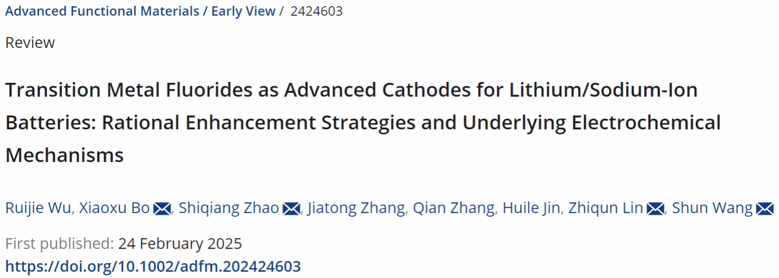 该成果以“Transition Metal Fluorides as Advanced Cathodes for Lithium/Sodium-Ion Batteries: Rational Enhancement Strategies and Underlying Electrochemical Mechanisms”为题发表在国际材料类顶级期刊⟪ Advanced Functional Materials ⟫上。永利3044集团官网为第一通讯单位,永利2022级硕士生吴瑞洁为第一作者,永利赵世强副教授、王舜教授、温州科技职业学院薄晓旭博士、新加坡国立大学林志群教授为共同通讯作者。相关研究工作受到国家自然科学基金项目(21905208、52331009)、浙江省自然科学基金(LY23B030001)和温州市基础科研项目(G20240025)的资助。