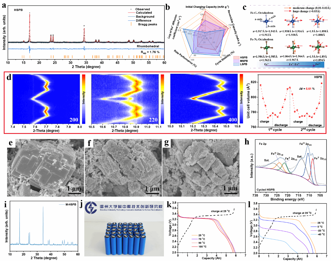 近日,永利侴术雷教授团队系统的揭示了PBAs在循环过程中发生容量衰减的多尺度机制:不可逆相变、晶格畸变引发破坏性结构退化、电极表面活性位点损失与过渡金属溶出。基于此,提出配位环境调控-晶核生长优化的双重策略,显著提升了PBAs的结构稳定性。采用改性PBAs正极与硬碳负极组装的18650/33140圆柱电池,在1000次循环后仍保持80%的容量与能量保持率,并实现在-40℃至100℃宽温域内稳定工作。该成果不仅明晰了PBAs容量衰减的争议性机理,更验证了其在长寿命、宽温区钠离子电池中的商业化应用前景。