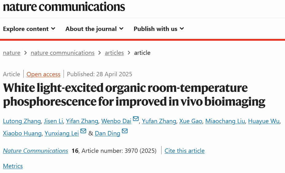 该论文以“White light-excited organic room-temperature phosphorescence for improved in vivo bioimaging”为题发表于国际顶级期刊⟪Nature Communications⟫上。永利3044集团官网为第一通讯单位,永利22级硕士生张鹭桐为第一作者,南开大学李济森博士为共同第一作者。永利3044集团官网戴文博博士、雷云祥特聘教授、以及南开大学丁丹教授为共同通讯作者,相关工作得到了国家自然科学基金的支持。据悉,这是该课题组以永利3044集团官网为第一通讯单位发表的第三篇Nature Communications。