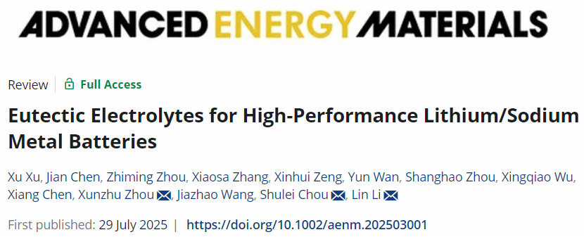 近日,永利侴术雷教授、李林特聘教授课题组在国际权威期刊Advanced Energy Materials发表题为“Eutectic Electrolytes for High-Performance Lithium/Sodium Metal Batteries”的综述文章。该综述聚焦近年来在共晶电解液领域的研究进展,系统梳理了其在锂/钠金属电池中的应用潜力与关键挑战。本文从共晶电解液的形成机制出发,详细探讨其物理化学特性并系统总结了其在提升循环稳定性、快充能力、高电压兼容性与温度适应性等方面的进展,并展望了未来的研究方向。该综述为高性能锂/钠金属电池电解液系统的分子设计与界面调控提供了重要参考。相关文章发表在Advanced Energy Materials上,永利3044集团官网为第一通讯单位,第一作者是永利2023级硕士研究生徐旭,永利侴术雷教授、李林特聘教授及周洵竹博士为共同通讯作者。相关工作受到国家自然科学基金,浙江省自然科学基金等基金的资助。