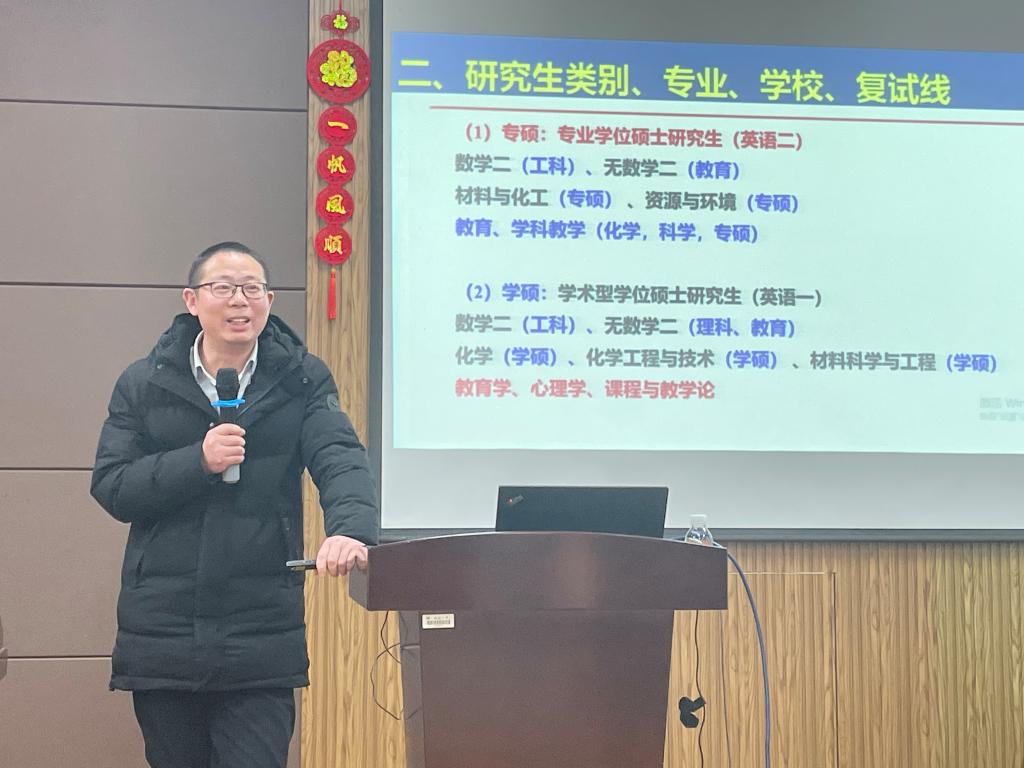 最后,化学系主任方国勇老师进行总结,方老师分析了2024年考研形势,介绍了研究生的类别、专业、学校、复试线和考研的注意事项,强调了选择大于努力,并预祝各位同学好运,考研顺利。