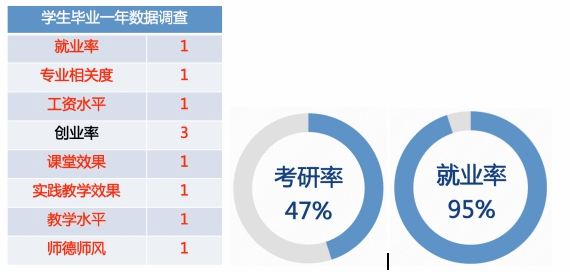 专业学生近三年毕业率100%,学位授予率98.74%,就业率超过95%,考研率47%,根据浙江省毕业生第三方调查结果显示,7项指标位列浙江省高校同类专业第1位。