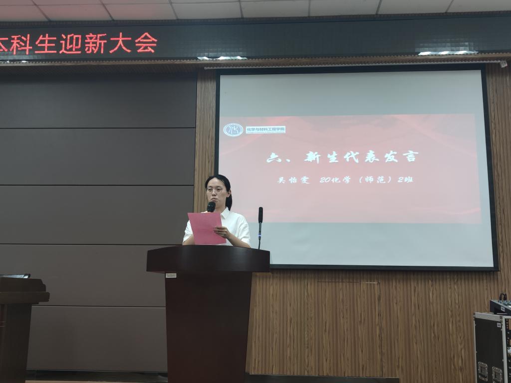 之后,由18化学创新班徐北航作为老生代表讲话,他对新生提出几点建议:明确目标;做出正确选择;与人为善,真诚待人。由20化学师范2班吴怡雯同学作为新生代表讲话,她对未来四年的大学生活表示美好的期待。
