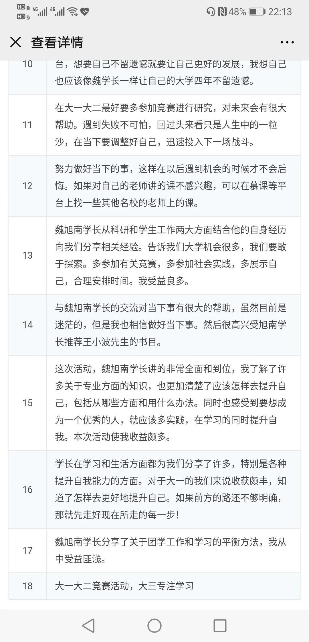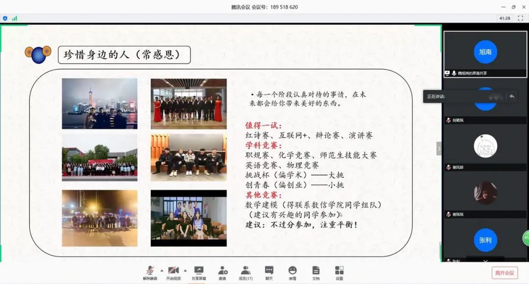 本次活动有18名同学积极参与其中。魏旭南学长在活动前精心准备了PPT,活动期间讲述了他在大学期间参与的一些学习活动和学生工作,同时分享自己的建议并积极为学弟学妹答疑解惑。