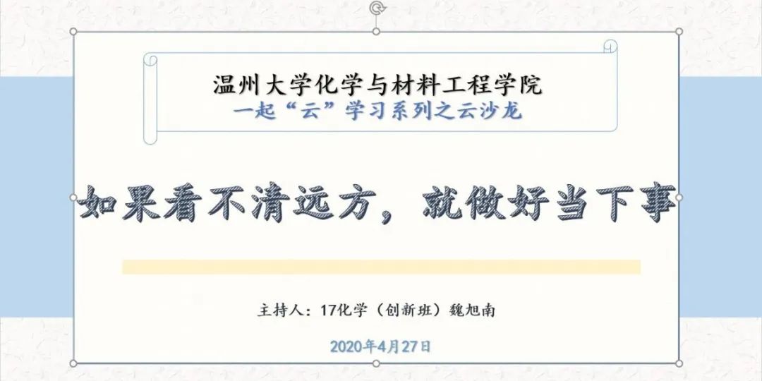 2020年4月27日晚18:30,在腾讯会议开展了永利3044集团官网第二期“云”沙龙活动。本次“云”沙龙的主题为“如果看不清远方,就做好当下事”,主讲人是来自17化学创新的魏旭南。