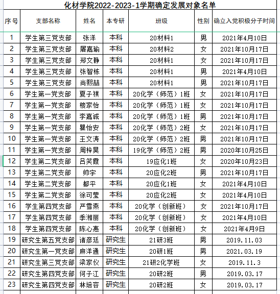 经本人申请,党组织一年以上的培养教育和考察,各支部于近期组织发展对象公开答辩,并征求党员、群众和培养联系人意见,召开支委会讨论研究,提交学院党委讨论备案,拟确定张洋等23名入党积极分子为发展对象。推荐到学校党校参加发展对象培训班学习,培训结业后拟按照程序召开支部大会讨论接收其为中共预备党员。为增强发展党员工作的透明度,接受党内外群众监督,确保发展党员的质量,根据《中国共产党章程》和《中国共产党发展党员工作细则》的相关规定,现将拟发展对象的基本情况进行公示:
