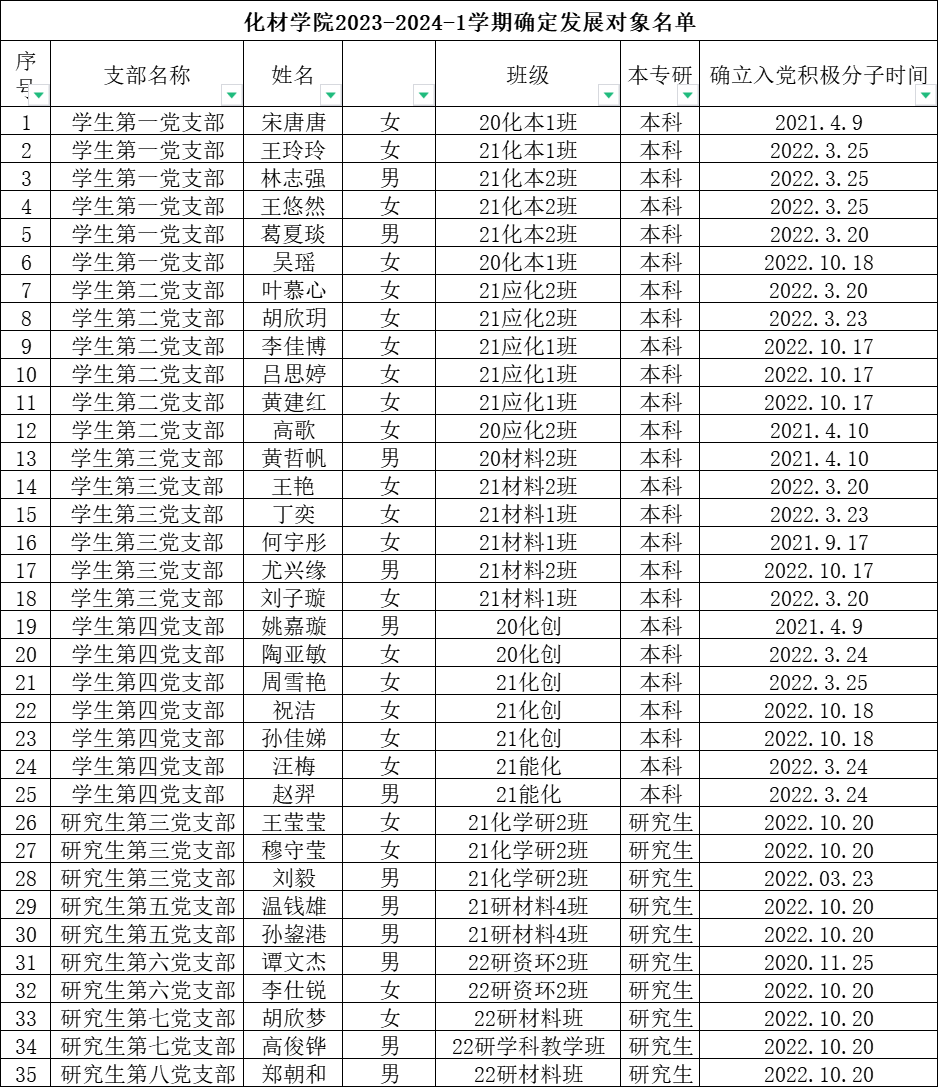 经本人申请,党组织一年以上的培养教育和考察,各支部于近期组织发展对象公开答辩,并征求党员、群众和培养联系人意见,召开支部大会讨论研究,拟确定宋唐唐等35名入党积极分子为发展对象。公示后报学院党委审批,推荐到学校党校参加发展对象培训班学习,培训结业后拟按照程序召开支部大会讨论接收其为中共预备党员。