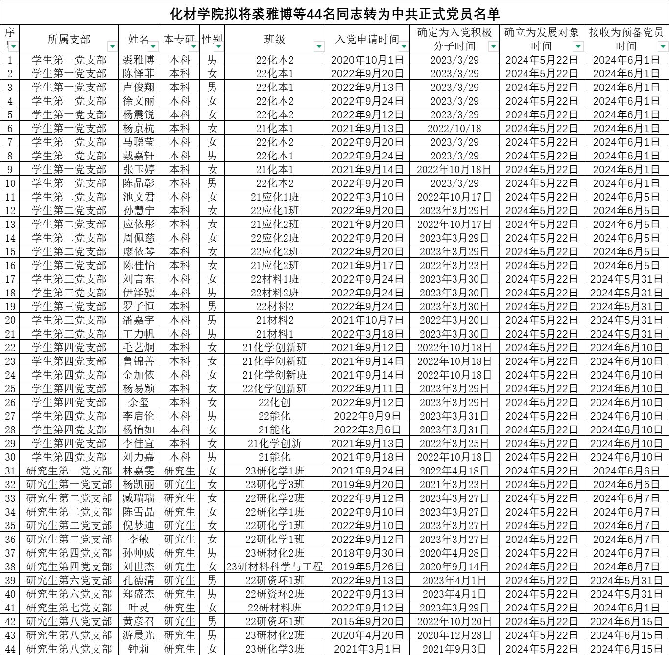 根据《中国共产党发展党员工作细则》,在听取党小组和党员、群众意见的基础上,经支部委员会审查,拟将裘雅博等44同志转为中共正式党员,并于近期召开支部大会讨论其转正问题。根据发展党员工作有关要求,现将其有关情况公示如下: