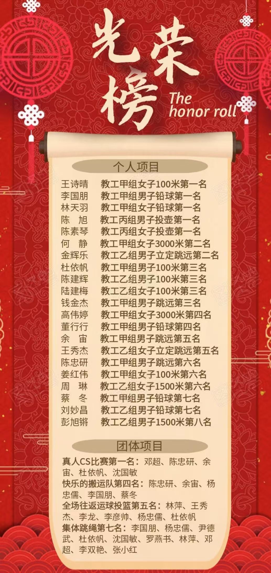 经过两天紧张、激烈的角逐,永利代表队首次获得教工组团体总分第一,总分154分,创历史新高。先后在铅球、100米、投壶等项目上荣获5项个人冠军和真人CS比赛团体冠军1项,另外还获得2项亚军、4项季军,团体第一名的奖牌里有化材运动健儿的风采,也有岗位上每一位拉拉队员的奉献。全体化材人认真践行“更高、更快、更强”的体育精神,深入贯彻“三全育人”文化内涵。