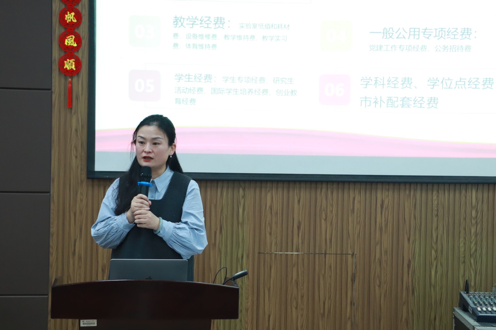 办公室主任林萍作财务工作报告。她介绍了2024年度学院收支情况及预算执行情况。学院财务状况运行平稳,执行力好,高效完成学院年初预算,有力地支持了学院教学、科研、管理等各项工作。